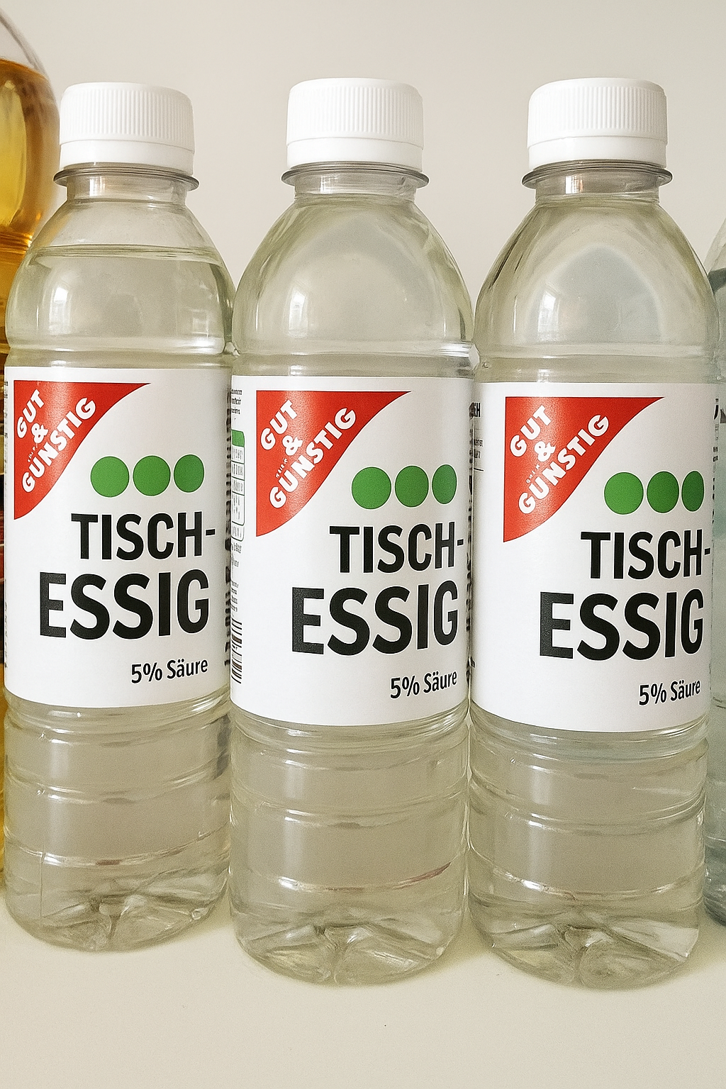 1 Liter Wasser + 1–2 Gläser Haushaltsessig.