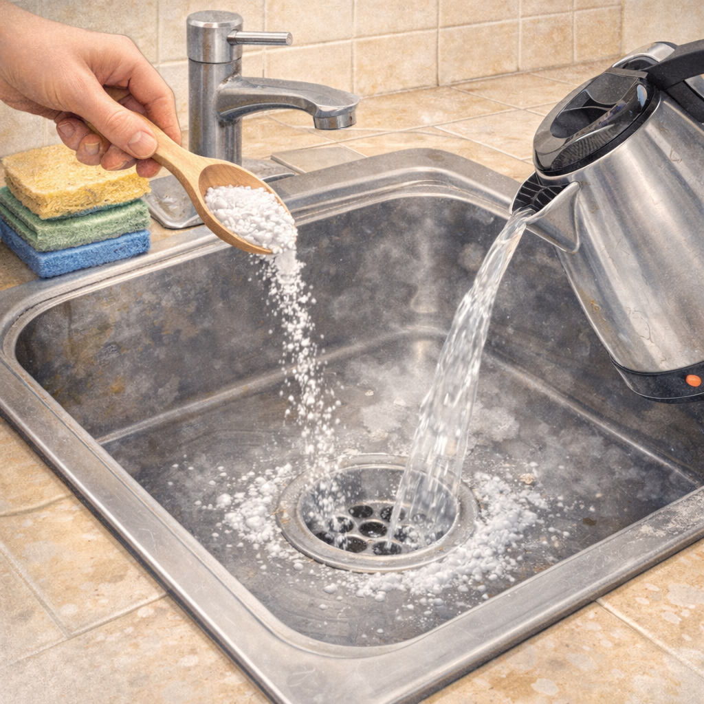 - 2–3 Esslöffel Waschsoda in den Abfluss geben