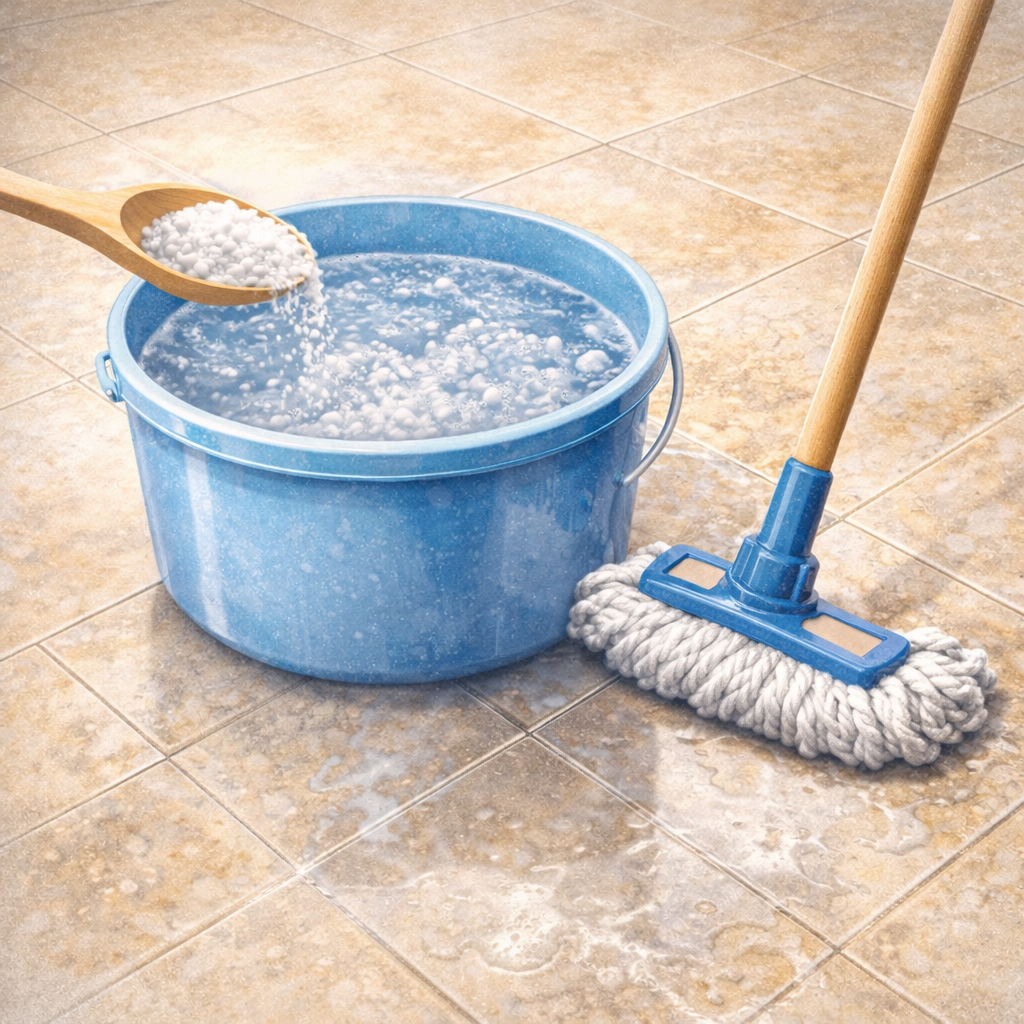 1 Esslöffel Soda in einen Eimer mit warmem Wasser geben und den Boden wischen.