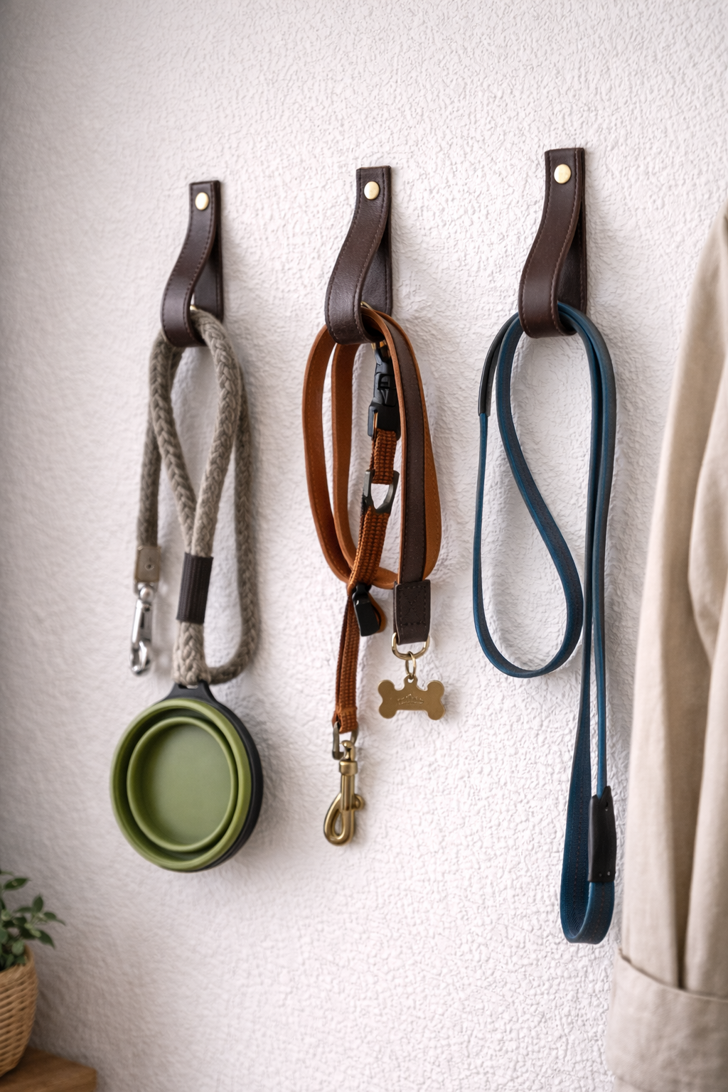 Aus stabilen Ledergürteln lassen sich kurzfristig robuste Halterungen herstellen — zum Beispiel für das Aufhängen von Hundeleinen oder Zubehör im Eingangsbereich.