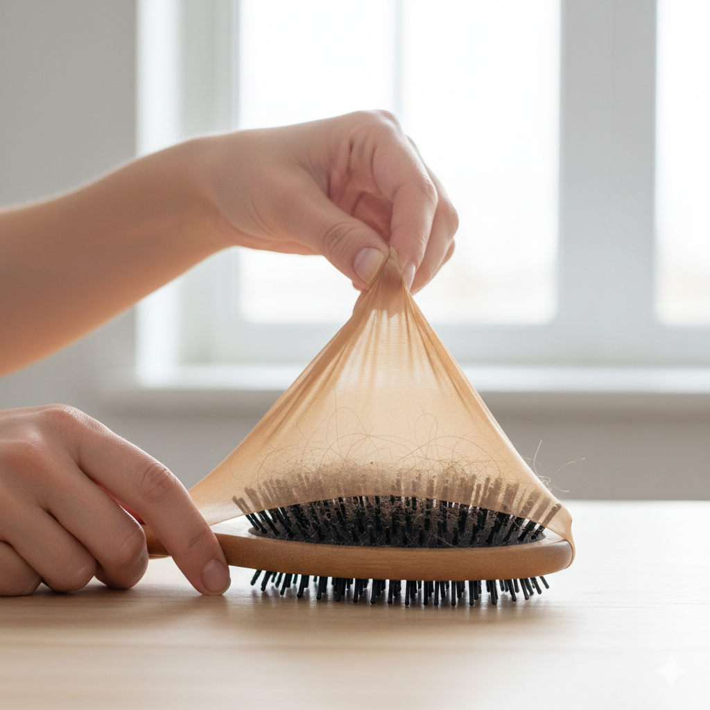 Ziehen Sie ein passendes Stück Strumpfhose über die Borsten Ihrer Haarbürste, bis es flach auf dem Bürstenboden aufliegt. Wenn sich Haare und Staub angesammelt haben, ziehen Sie das Nylon einfach ab – die Bürste darunter bleibt wie neu und hygienisch sauber.