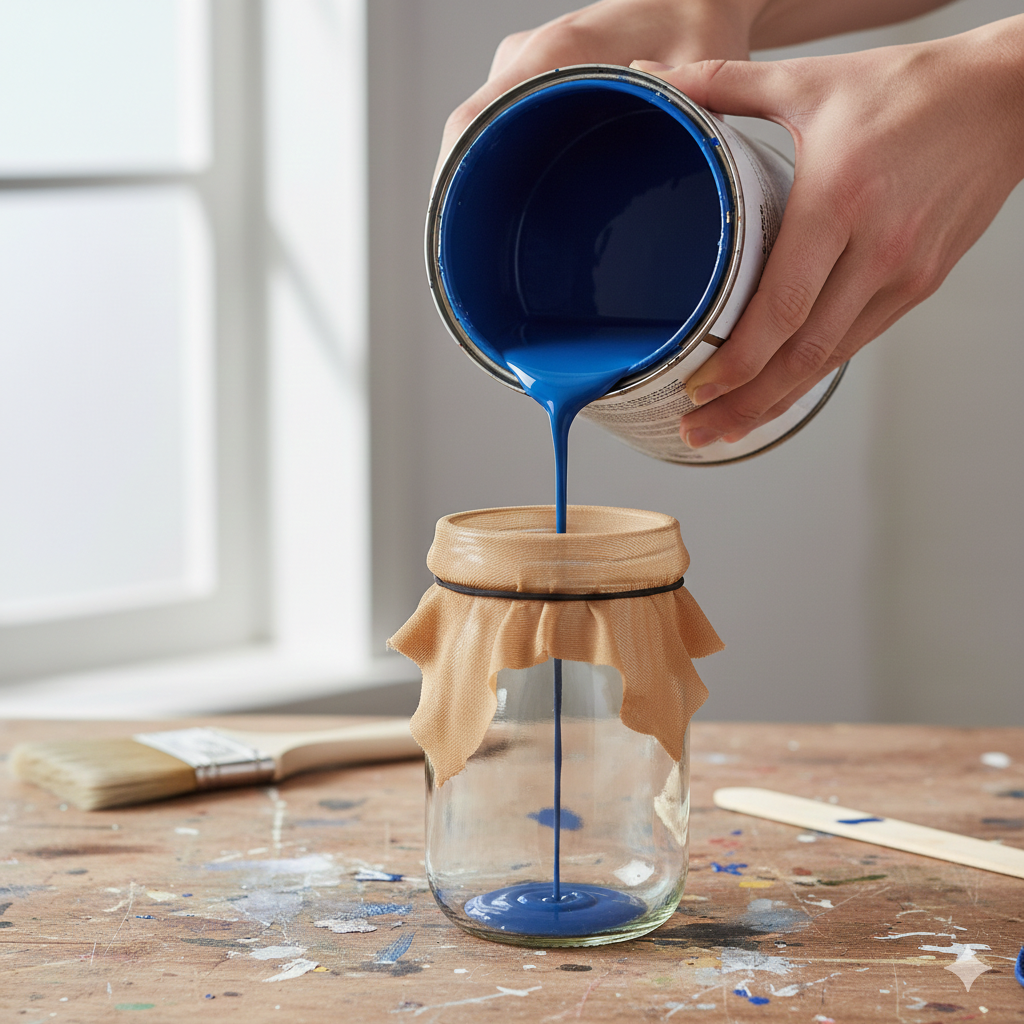 Wenn Sie alte Farbreste haben, die kleine Klumpen gebildet haben, werfen Sie diese nicht weg. Spannen Sie ein Stück Strumpfhose über ein sauberes Gefäß und gießen Sie die Farbe hindurch. Das feine Gewebe filtert selbst kleinste Partikel heraus, sodass Sie wieder eine glatte Farbe für Ihre Streicharbeiten haben.