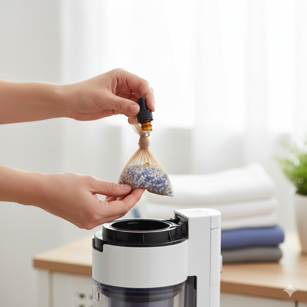 Geben Sie ein paar Tropfen ätherisches Öl oder etwas Waschmittel-Granulat in ein kleines Stück Strumpfhose, verknoten Sie es und legen Sie es direkt in den Staubsaugerbeutel (oder den Auffangbehälter). Bei jedem Saugen verteilt sich ein angenehmer Duft im ganzen Haus.
