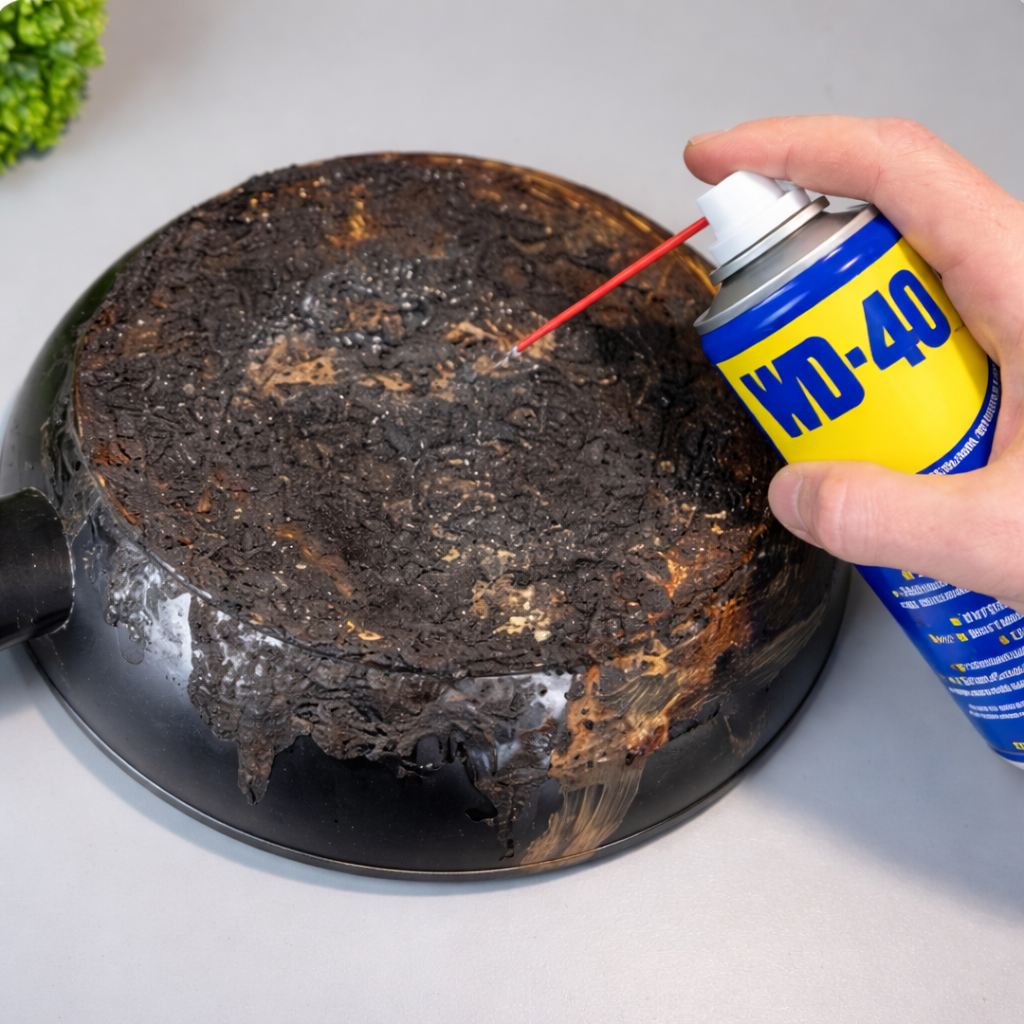 WD-40 ist kein Reinigungsmittel für Kochflächen, kann aber bei extrem hartnäckigen, alten Verkrustungen an der Außenseite der Pfanne sehr hilfreich sein.