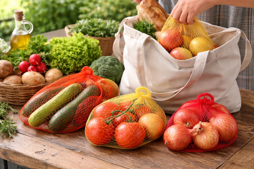 Wasche die Netze gründlich und verwende sie erneut, um beim nächsten Einkauf lose Früchte und Gemüse zu transportieren. Die Netze sind leicht, luftdurchlässig und helfen dir, Wegwerfplastik zu reduzieren.