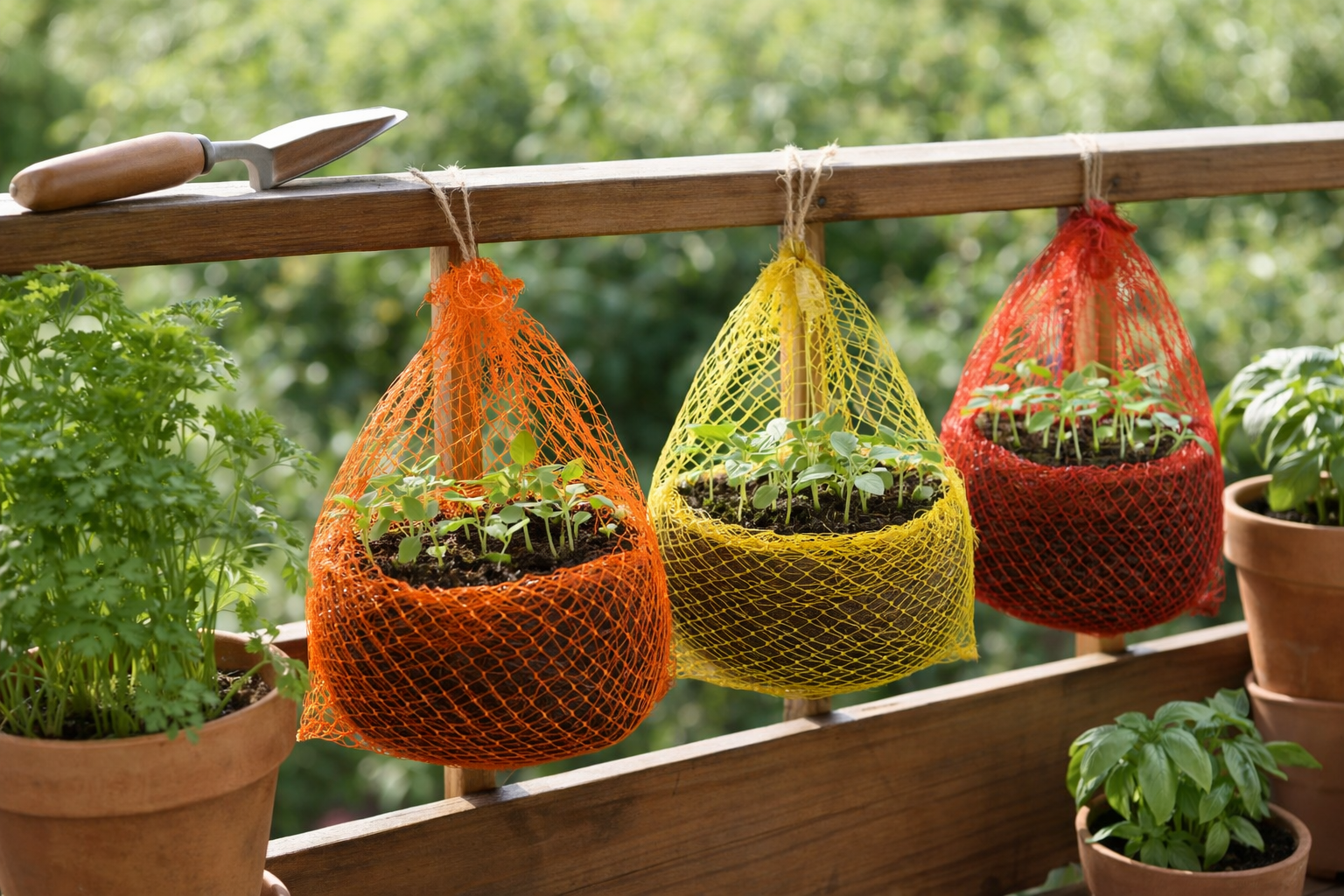 Fülle die Netze mit Erde und Samen und befestige sie an einem sonnigen Platz. Die atmungsaktive Struktur fördert die Wurzelbildung und schützt junge Pflanzen beim Keimen.