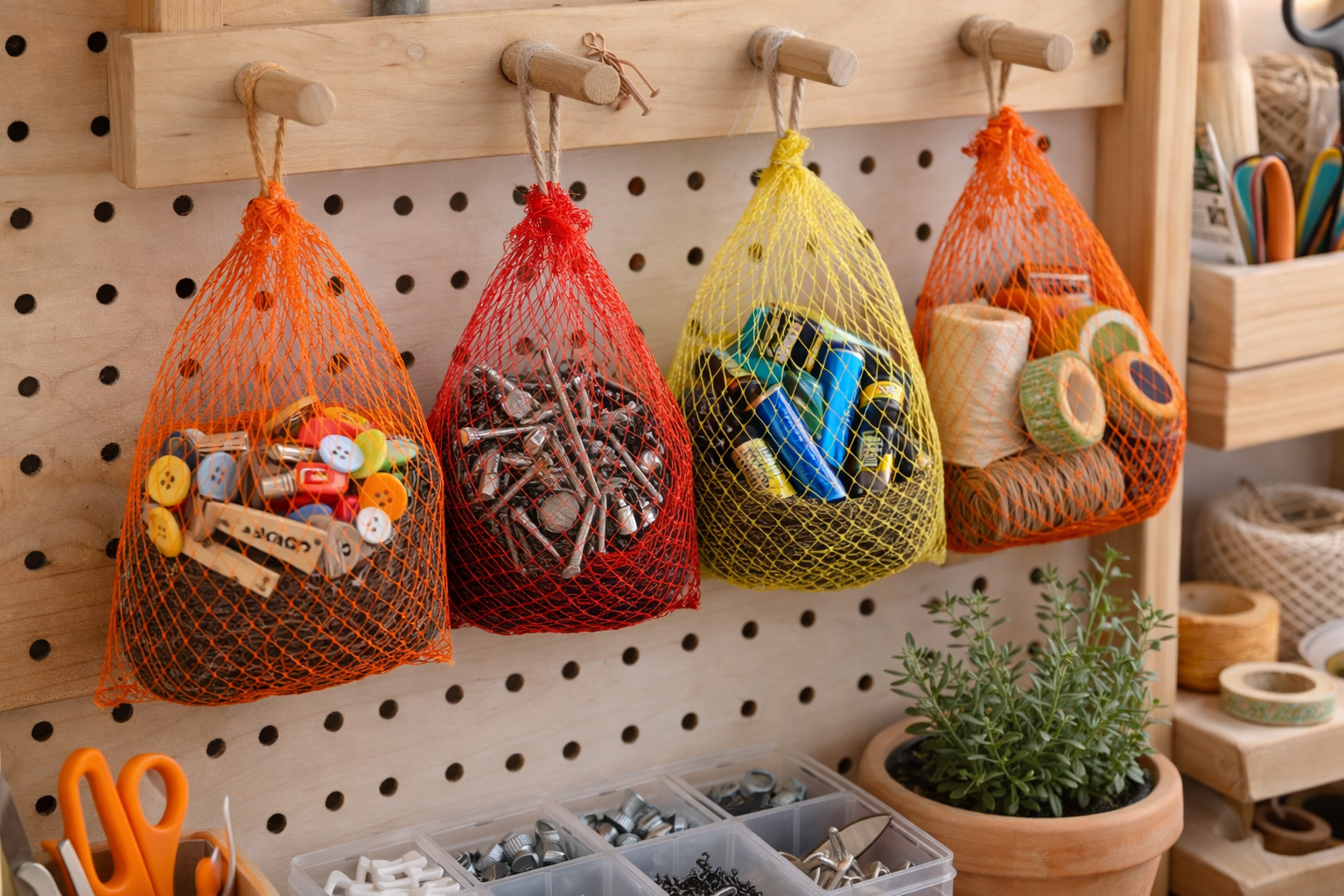 Ordne Bastelmaterial, Schrauben, Batterien oder andere kleine Dinge in Netzbeuteln – so hast du alles gut sortiert und im Blick.