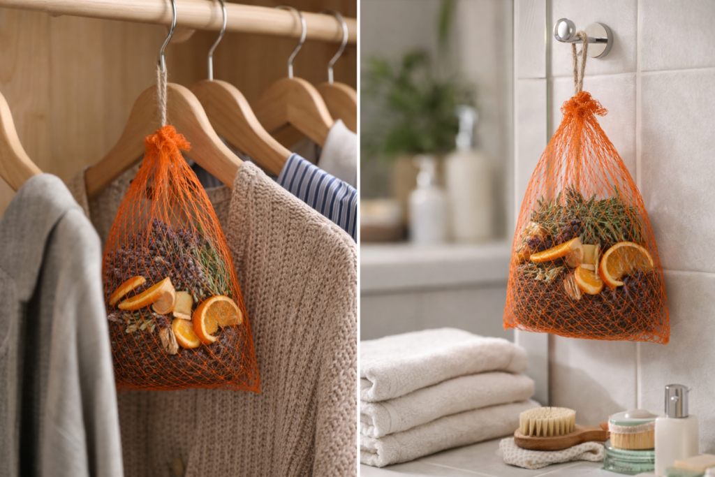 Lege ein paar getrocknete Kräuter, Orangenschalen oder Lavendel in ein Netz und hänge es in den Kleiderschrank oder ins Badezimmer – für frischen, natürlichen Duft ohne Chemie.