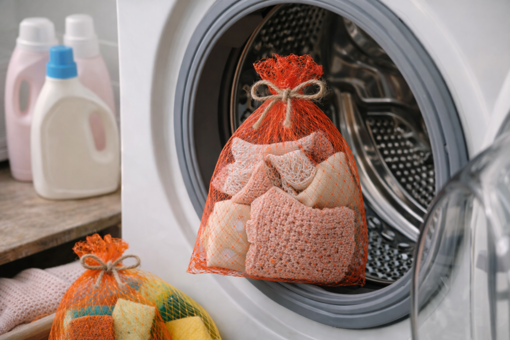 Netze eignen sich ideal als kleine Beutel zum sanften Waschen empfindlicher Stoffe oder Spüllappen in der Waschmaschine – sie schützen Textilien und geben Ordnung.