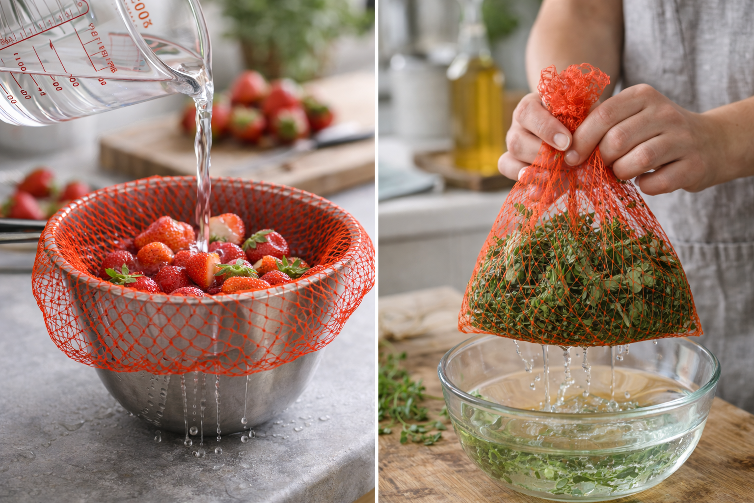 Wenn sie sauber und intakt sind, kannst du Netze kurzzeitig als Abseihhilfe oder Sieb verwenden, etwa beim Abtropfen von Beeren oder Kräutern.