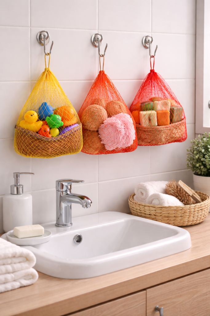 Hänge ein Netz an einen Haken und nutze es zur aufgeräumten Aufbewahrung von Seifen, Badspielzeug oder Schwämmen – so bleibt alles durchlüftet und trocken.