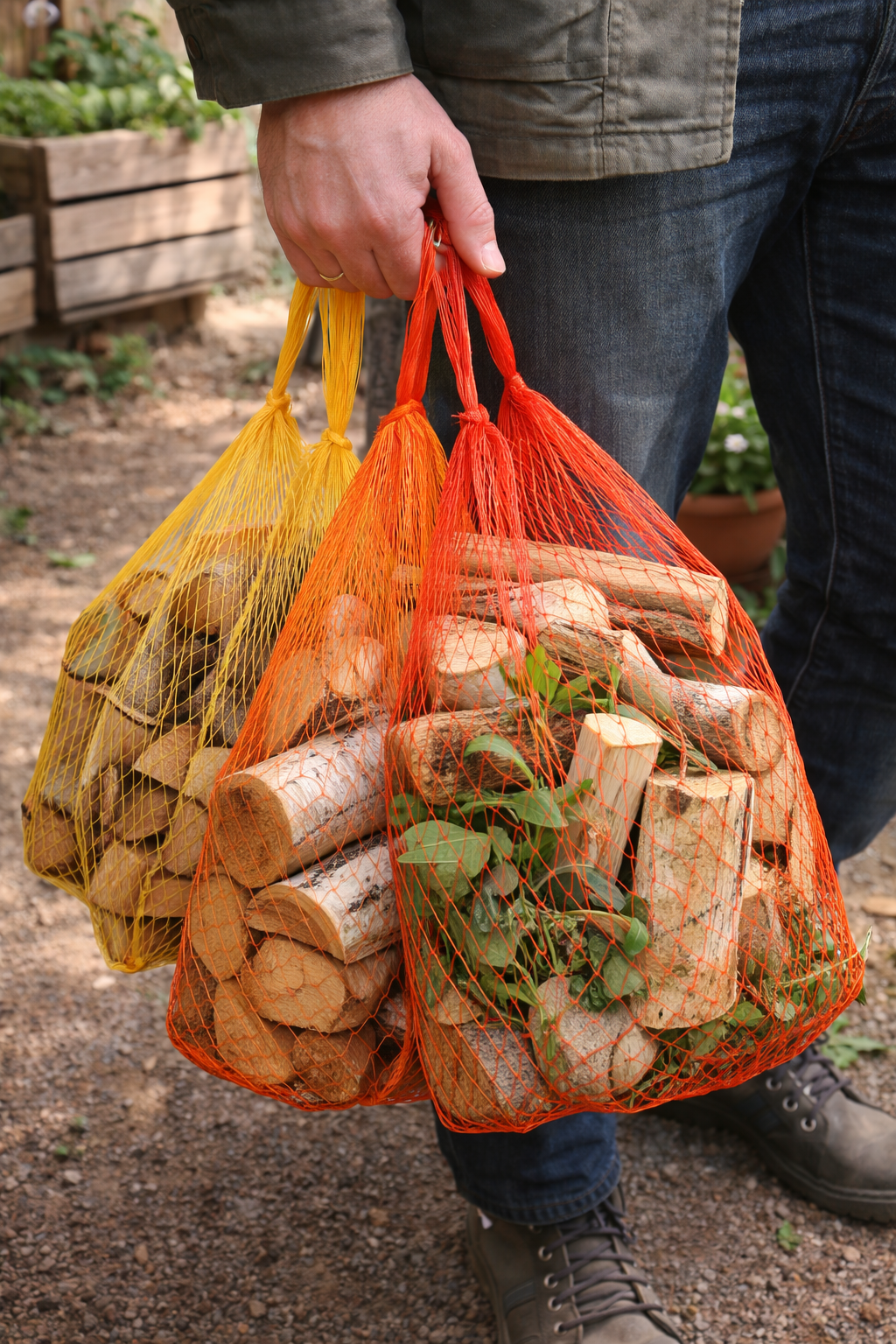 Mehrere Netze zusammen können als leichter Tragebeutel für schwere Gegenstände wie Holz oder Gartenmaterial dienen – eine einfache, robuste Lösung.