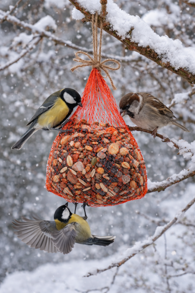 Fülle ein Netz mit Samen oder getrockneten Früchten und hänge es draußen auf – eine natürliche Futterhilfe für Vögel in der kalten Jahreszeit.