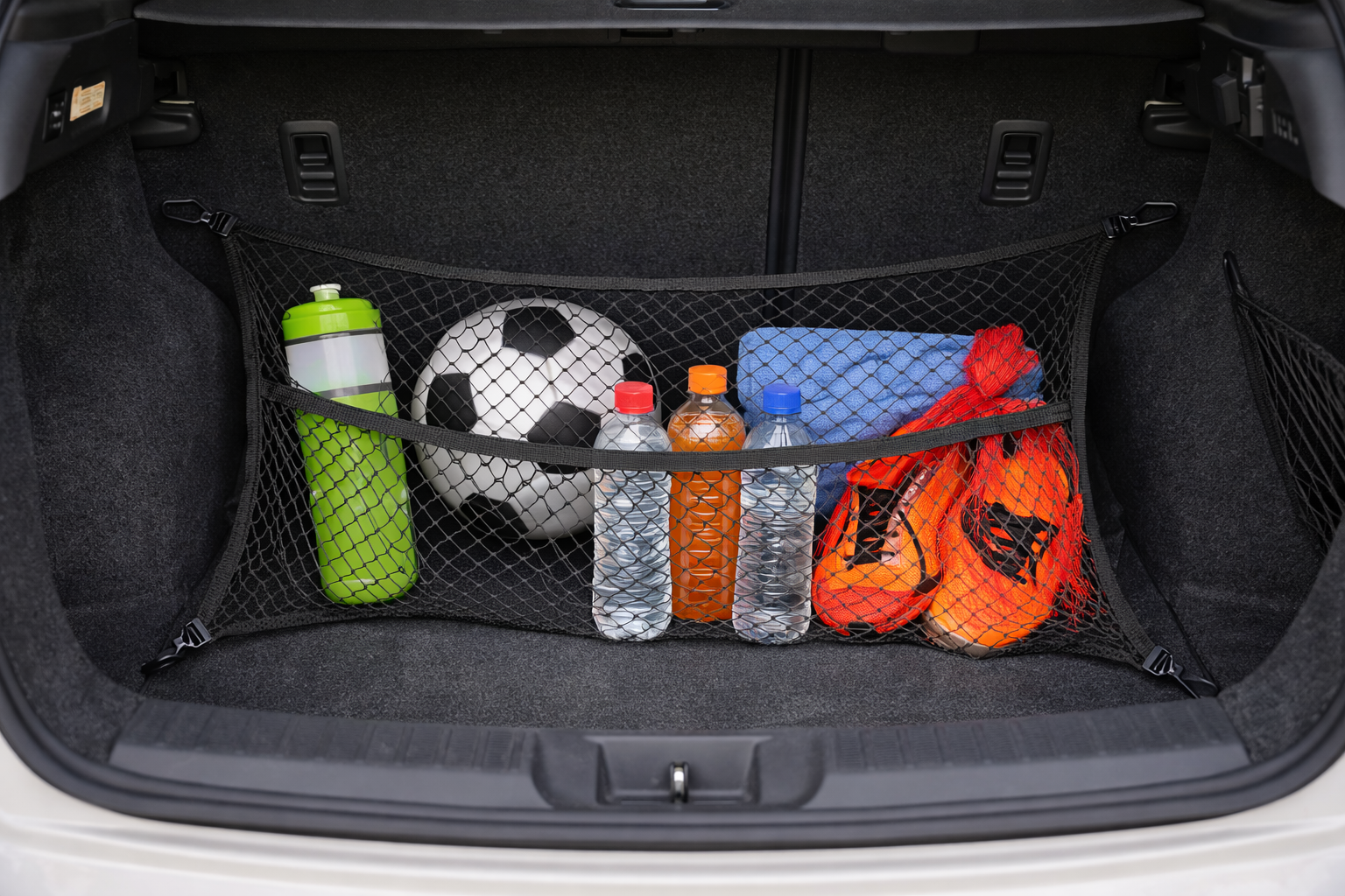 Befestige ein Netz im Kofferraum, um Getränke oder Sportsachen ordentlich zu verstauen – kein Gerolle mehr während der Fahrt.
