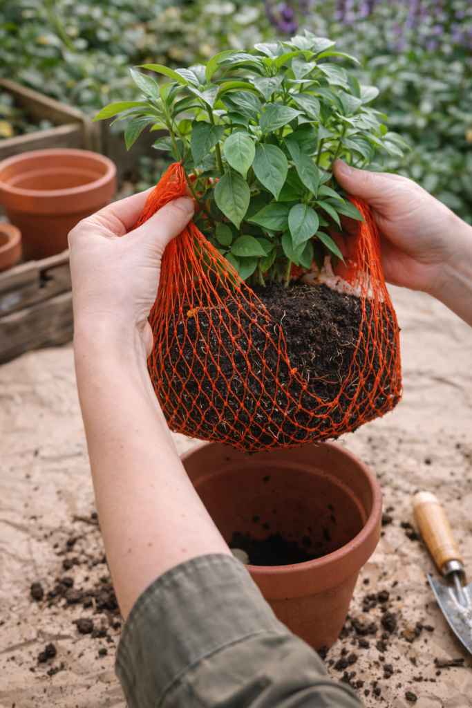 Beim Umtopfen kannst du Topfpflanzen mitsamt Netz vorsichtig herausheben – besonders bei empfindlichen Wurzeln sorgt das Netz für Stabilität.