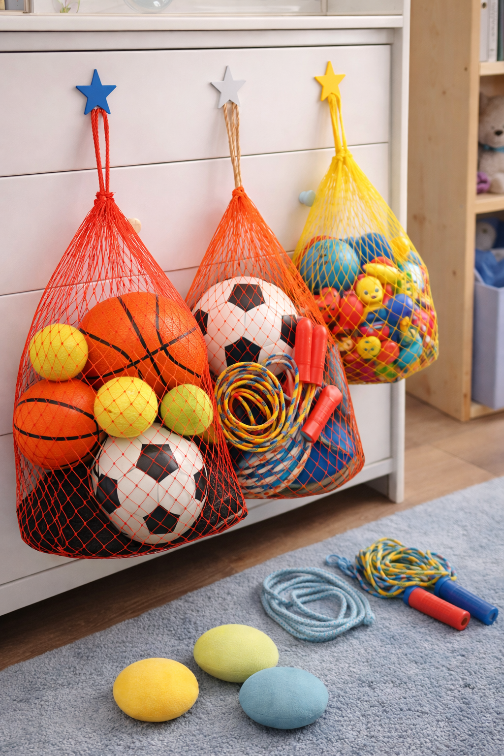 Ideal zur Ordnung im Kinderzimmer oder beim Sport: Nutze die Netze, um Bälle, Springseile oder kleine Spielsachen aufzubewahren.