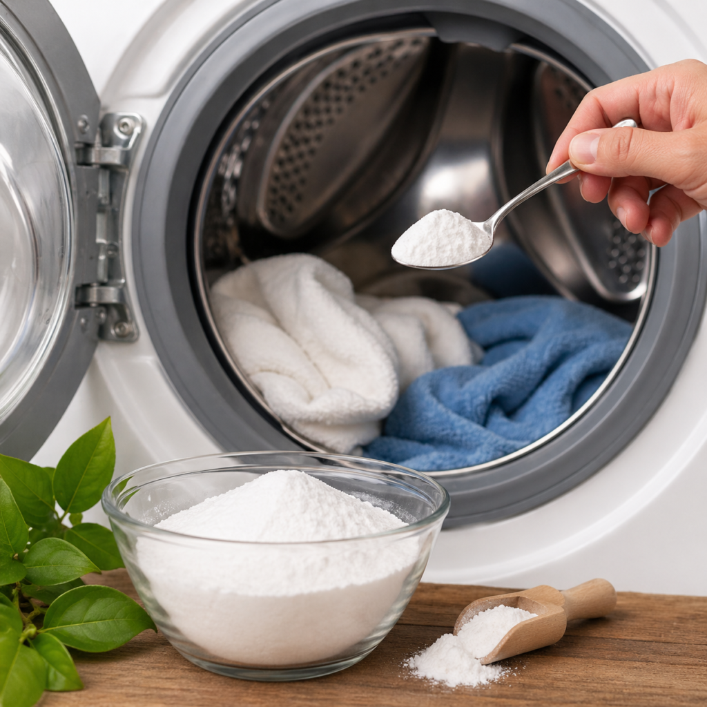• 1–2 Esslöffel Natron direkt zur Wäsche