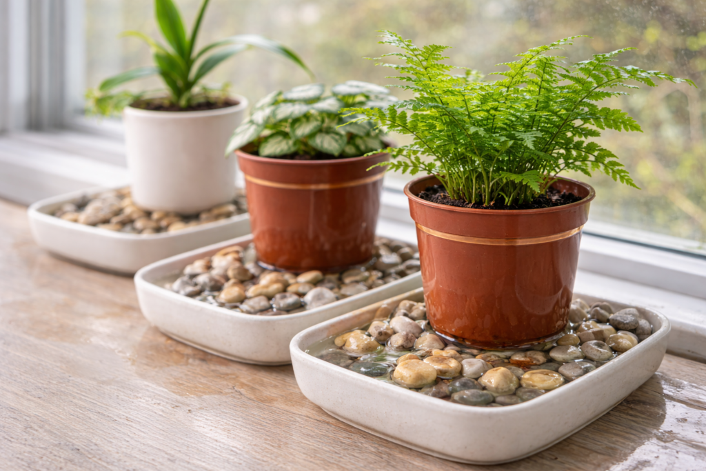 Der Trick: Die Töpfe stehen auf den Steinen, nicht direkt im Wasser (vermeidet Wurzelfäule!). Das verdunstende Wasser schafft eine feuchte Glocke um die Blätter.