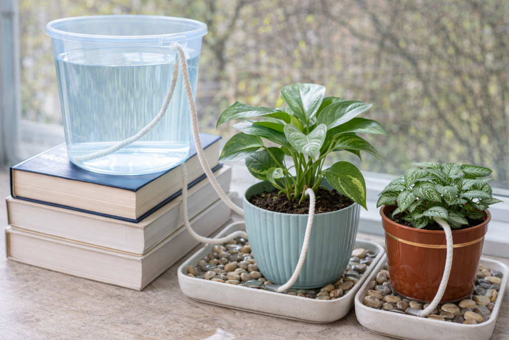 Stelle den Wassereimer höher als deine Pflanzen (z. B. auf einen Stapel Bücher).
