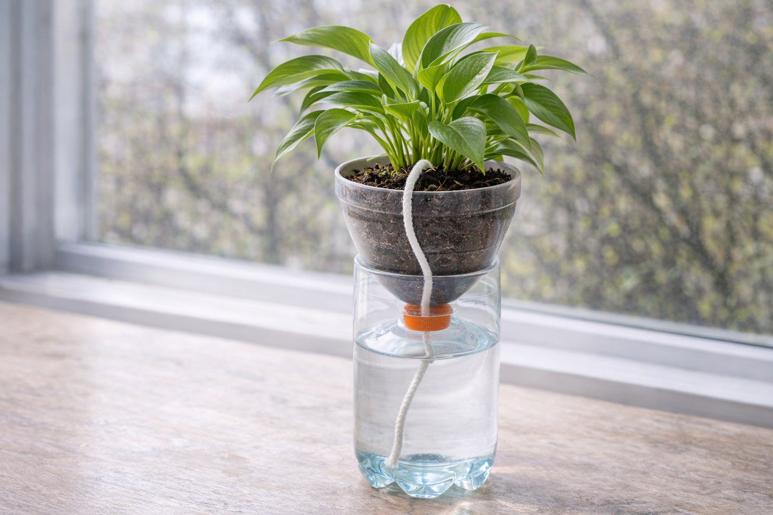 Montage: Fülle den unteren Teil mit Wasser. Den oberen Teil (mit dem Deckel nach unten) setzt du wie einen Trichter hinein. Fülle Erde und die Pflanze in den oberen Teil.