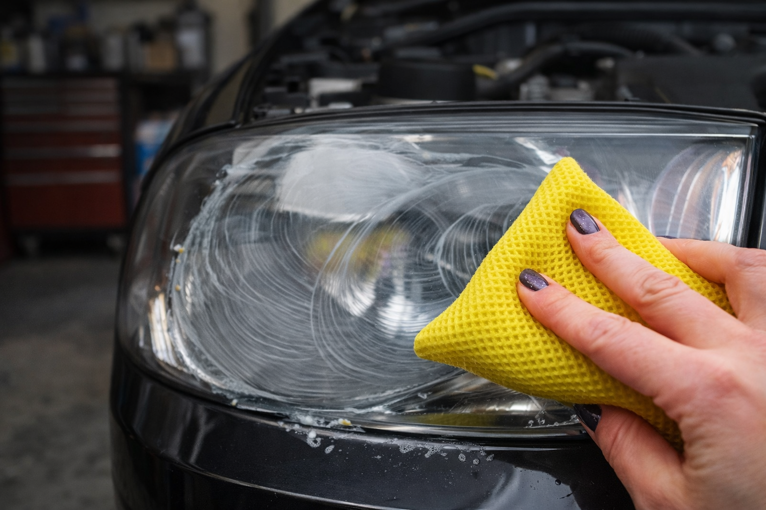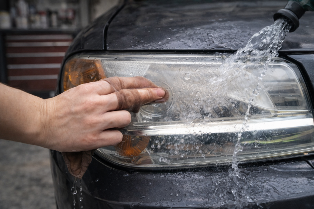 Spülen Sie die Scheinwerfer anschließend mit klarem Wasser ab. Diese Methode eignet sich vor allem bei leichter Verschmutzung oder leichtem Mattwerden.