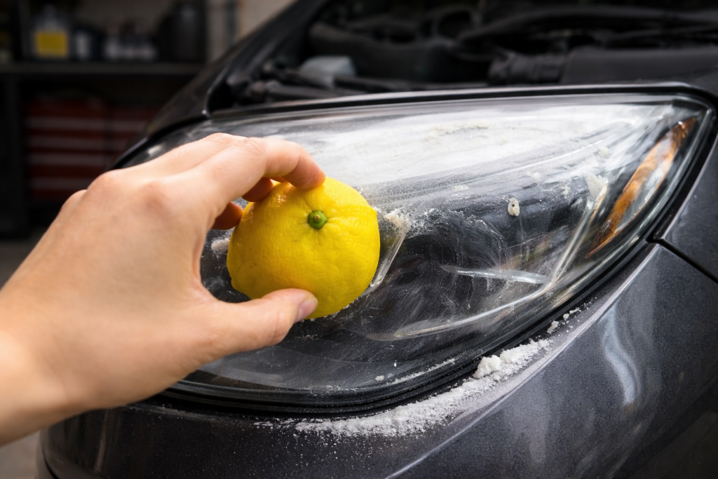 Schneiden Sie eine Zitrone in zwei Hälften und streuen Sie Natron darauf. Reiben Sie die Scheinwerfer mit der Zitrone in kreisenden Bewegungen.